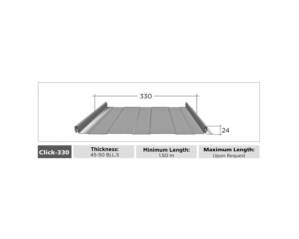 Atap Click 330 adalah produk atap yang memiliki profile gelombang rendah untuk bentang pendek hingga menengah tanpa sambungan dengan cara pemasangan boltless menggunakan sistem click. Atap Click 330 merupakan salah satu produk atap Fumira paling terbaru dengan rancangan minimalis untuk memenuhi kebutuhan profil atap boltless yang mudah ditangani dan dipasang.